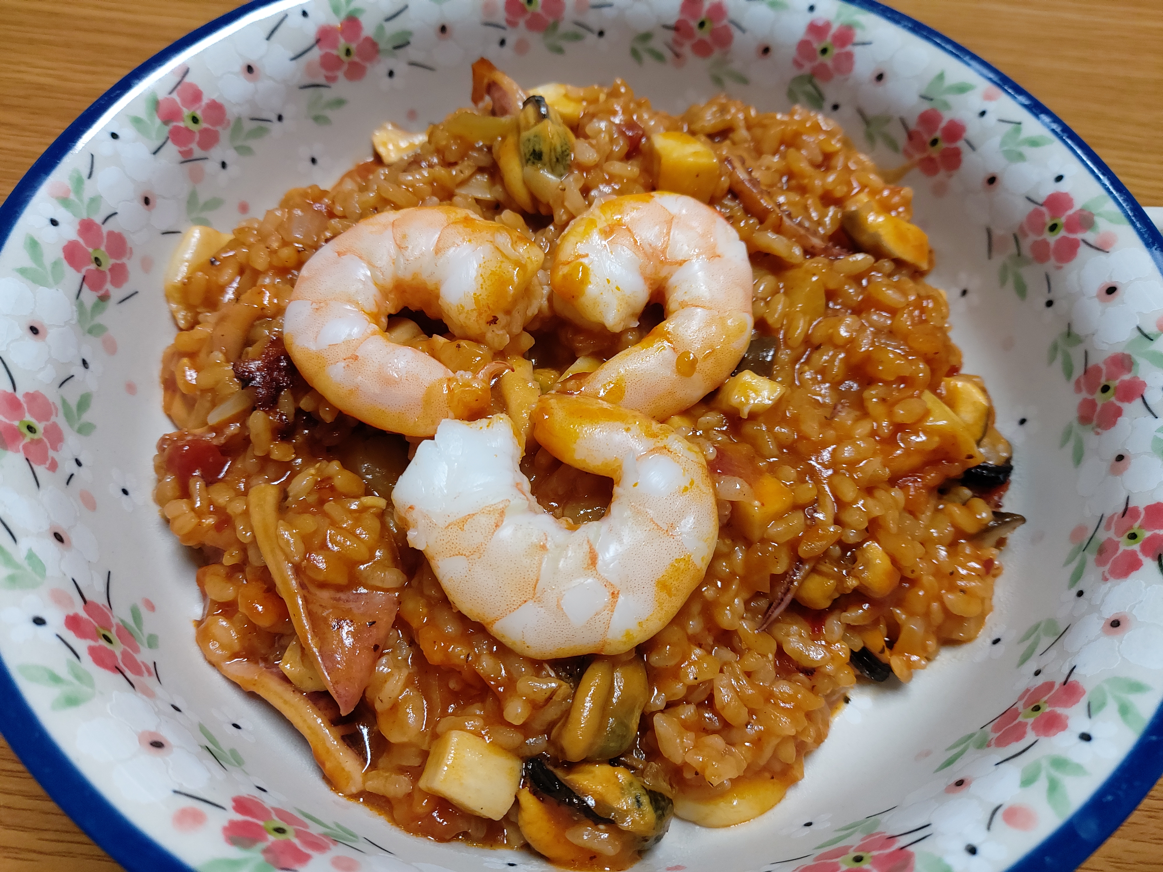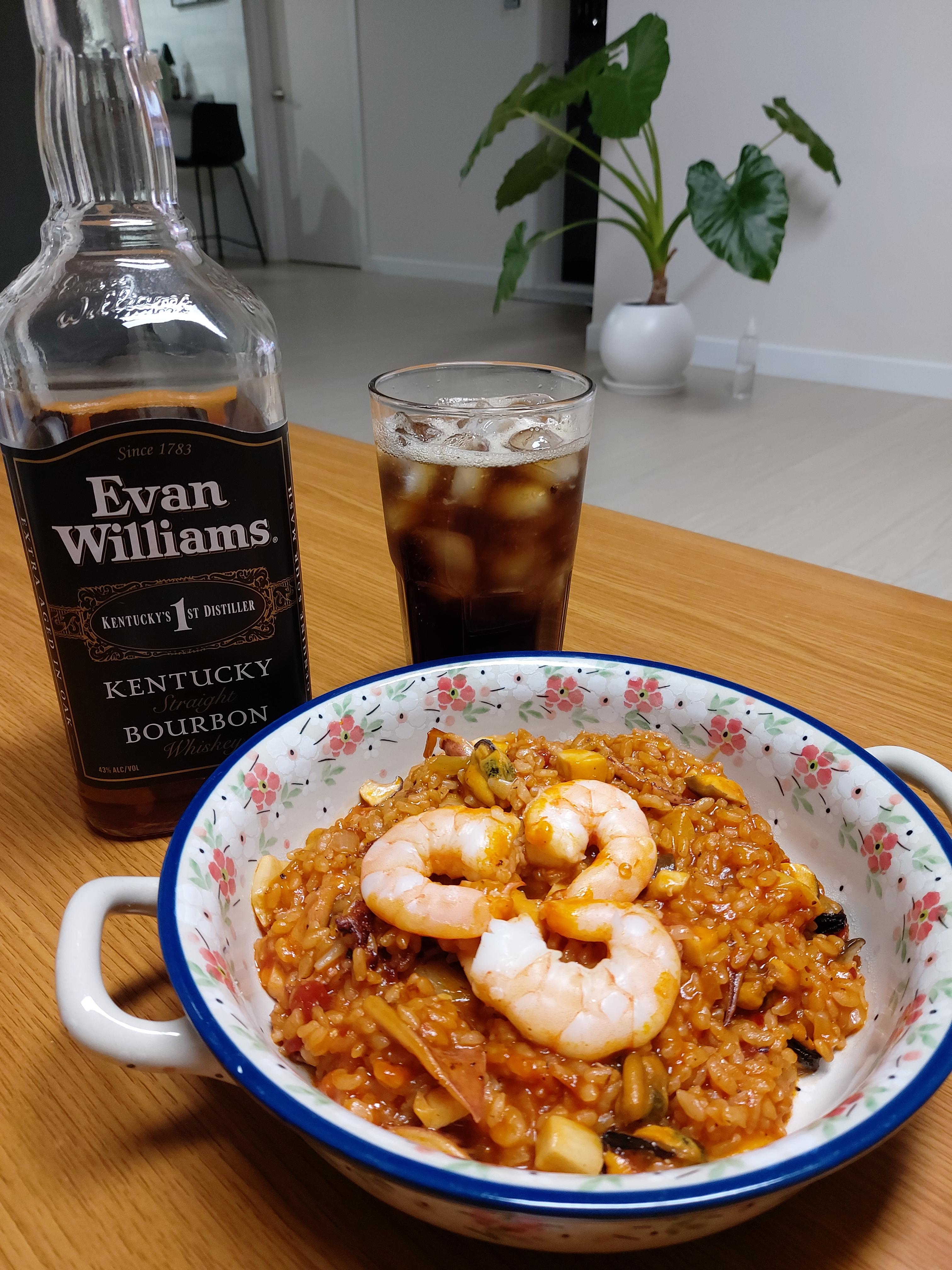 팬하나로 조리할 수 있어서 너무 편하고, 토마토 소스에 매콤한 고추와 시원한 해산물이 만나 정말 맛있게 먹었습니다.크크 맛있는 요리에 술이 빠질수 없죠. 올리브유에 볶은 마늘기음 베이스로 만들어진 맛있는 빠에야. 양식과 잘 어울리는 시원한 콜라에 버번 위스키 타서 한잔 시원 하게 잘 먹었습니다 !