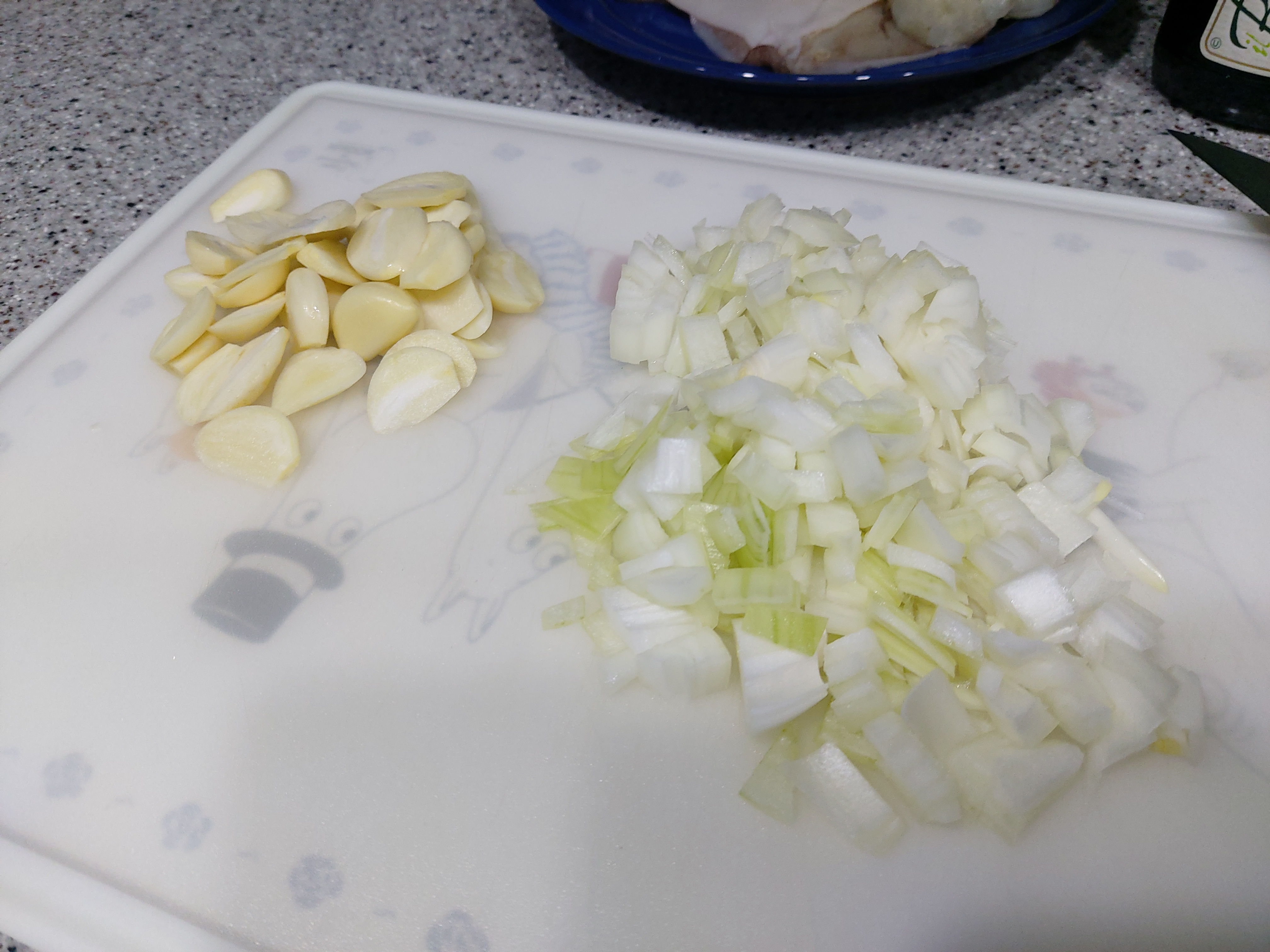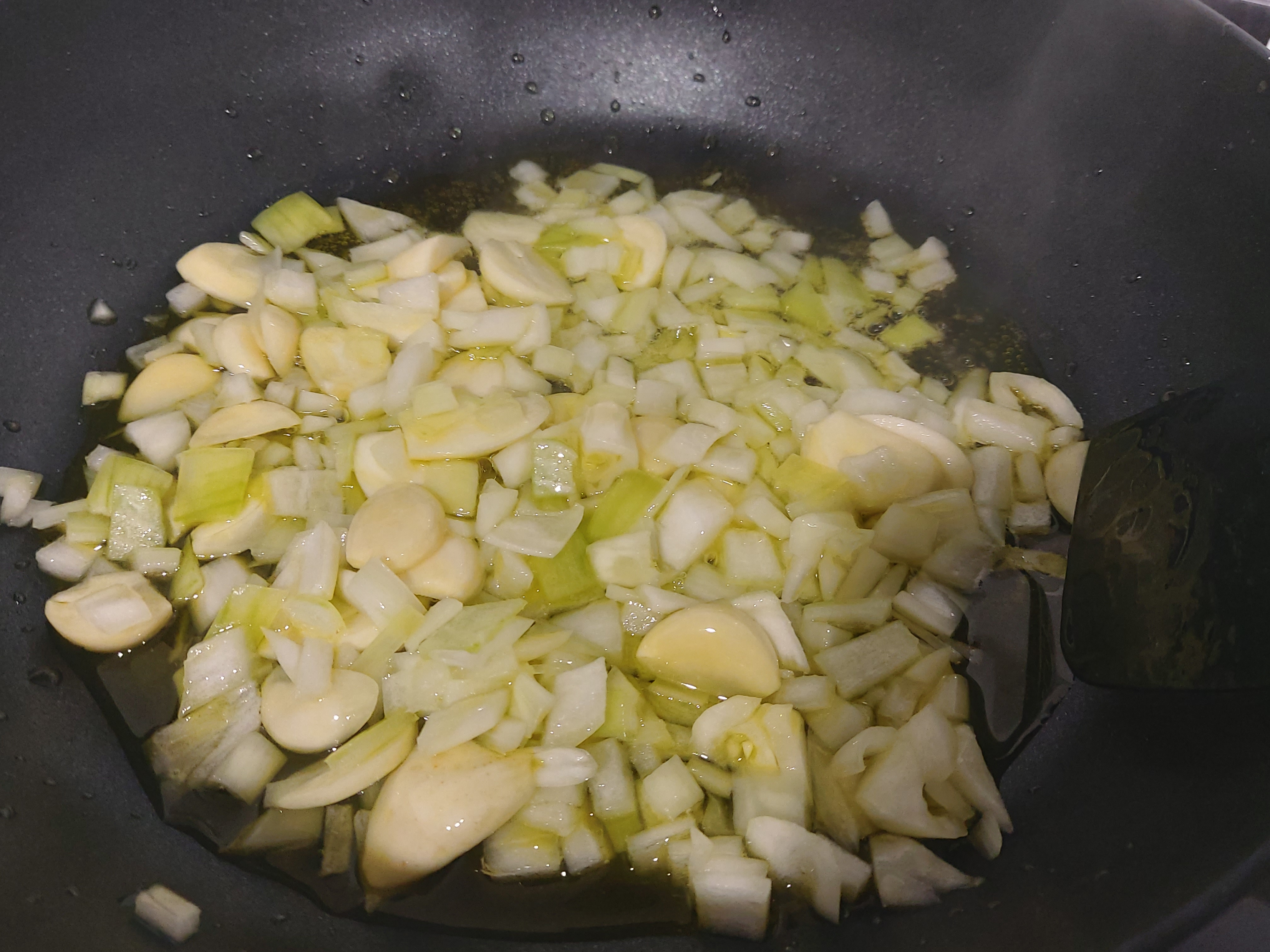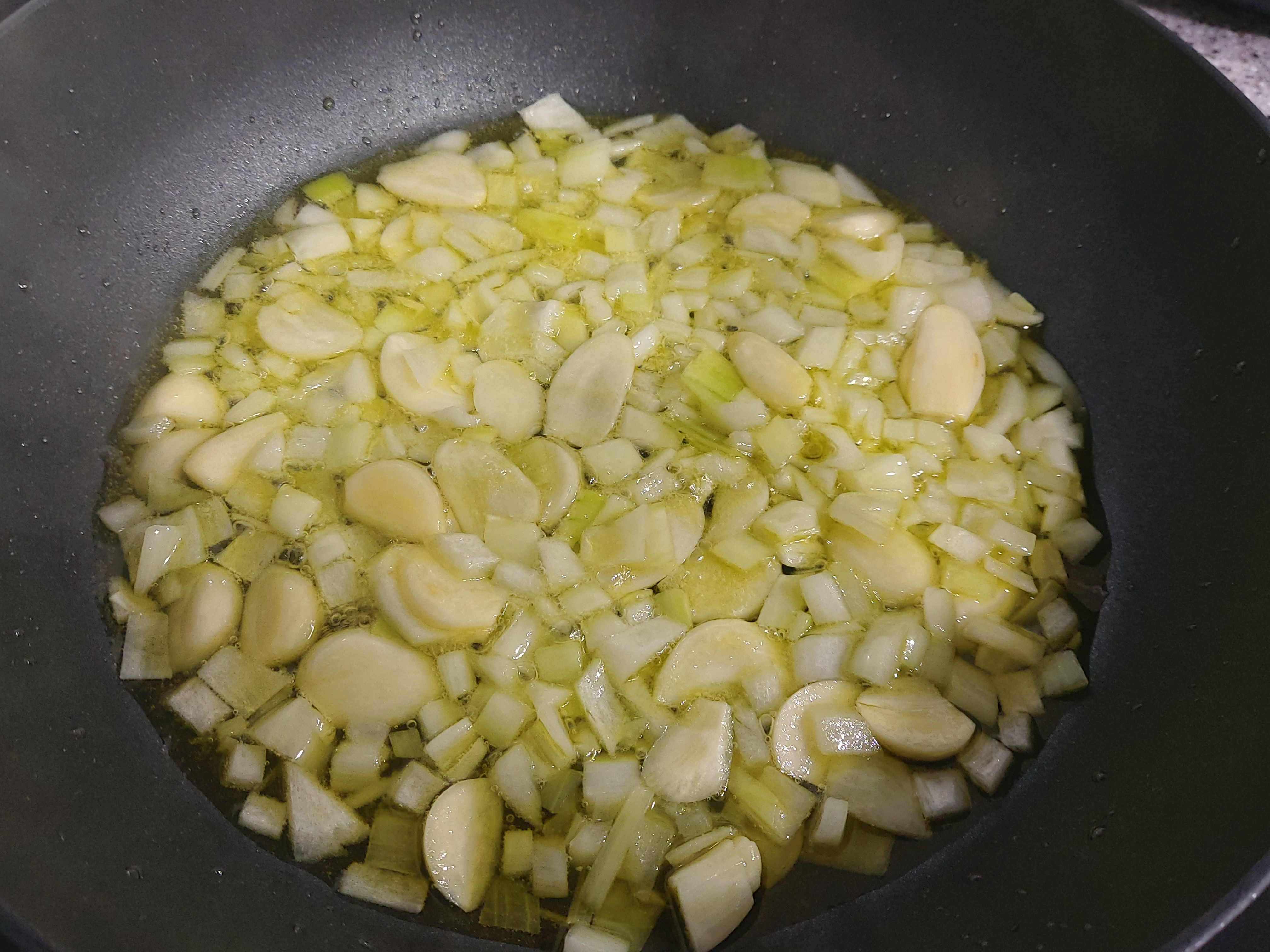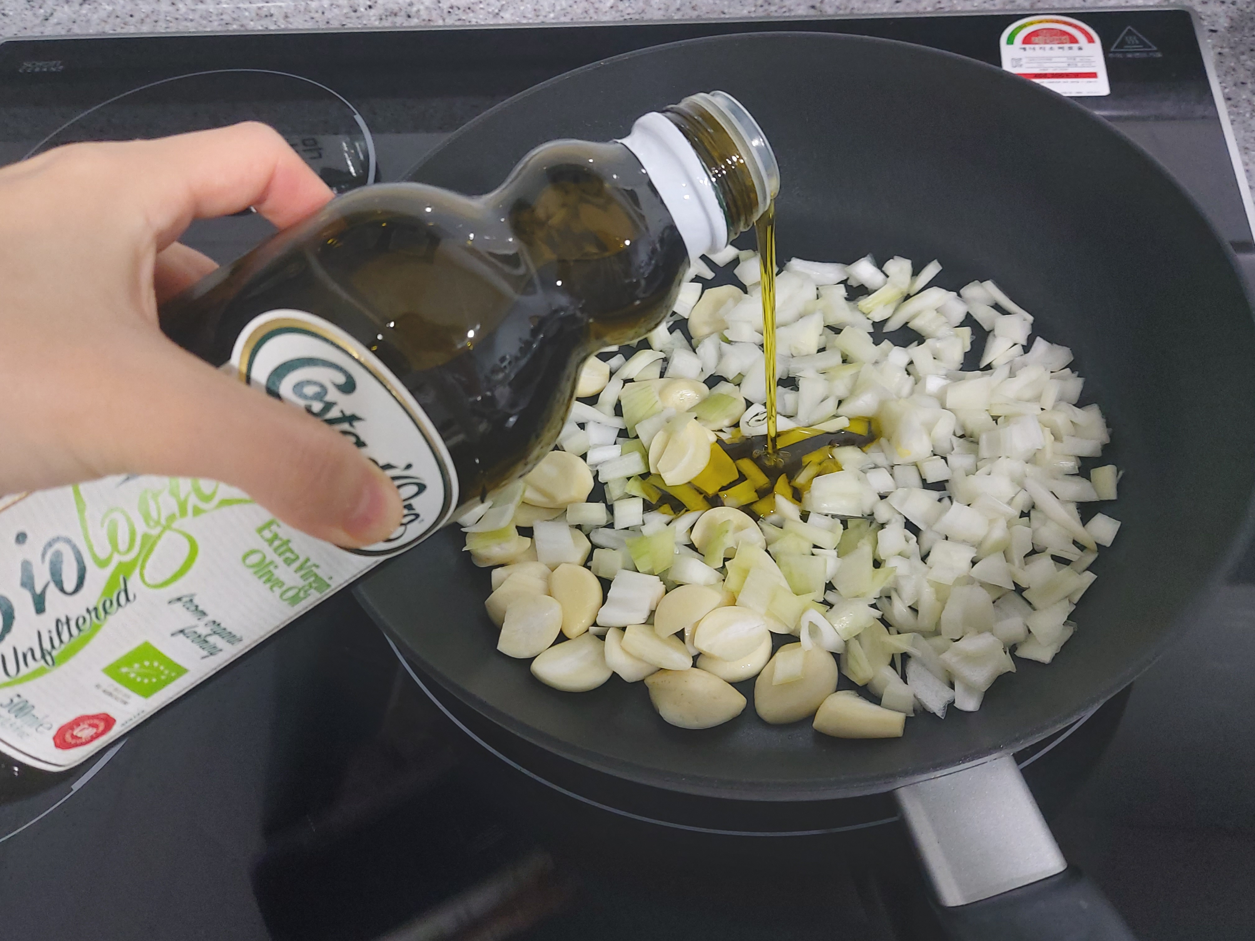 재료손질이 다 끝났으면 잘게다진 양파와 편마늘에 올리브유를 듬뿍 넣어 마늘 기름을 내 줍니다.