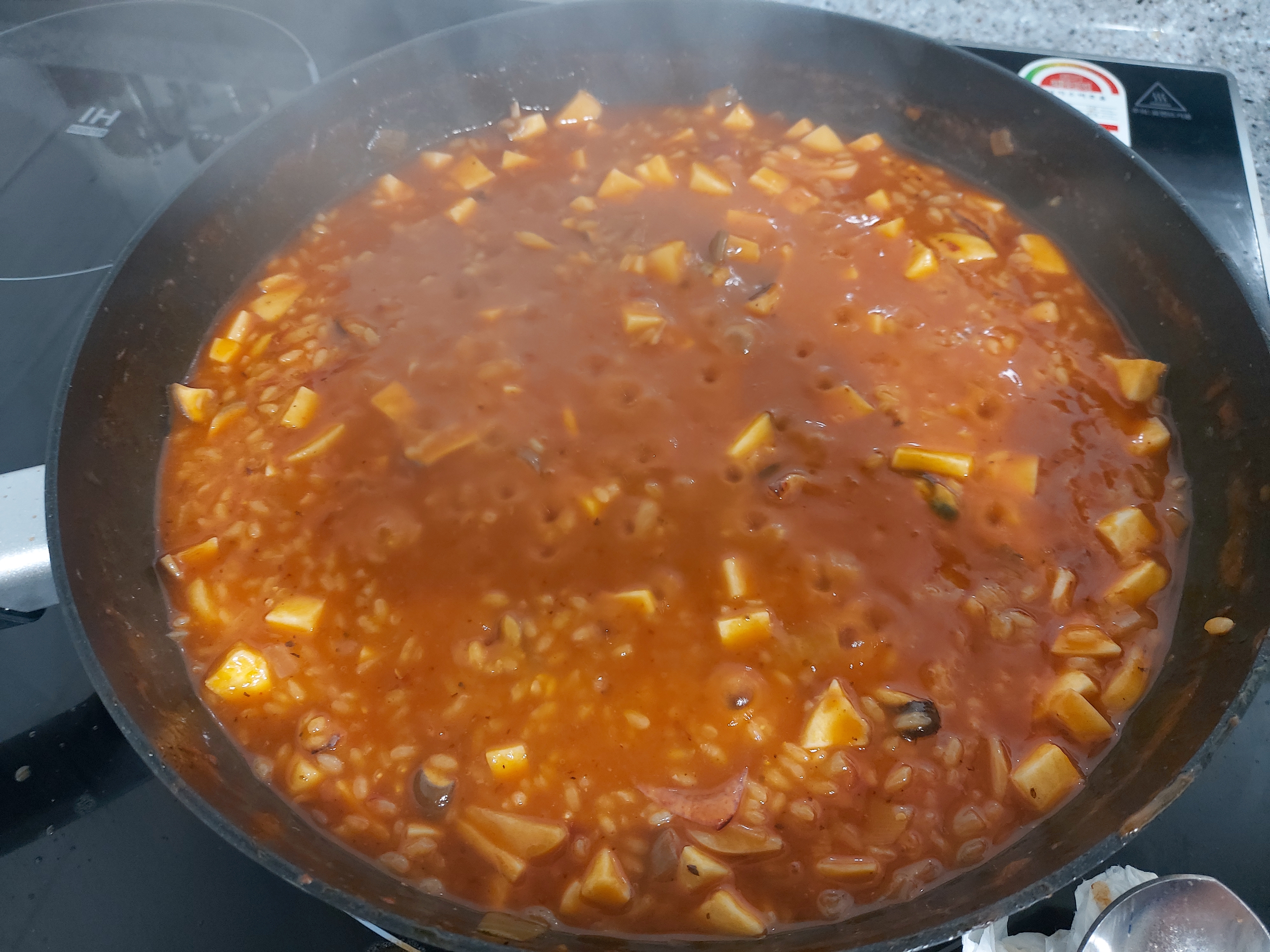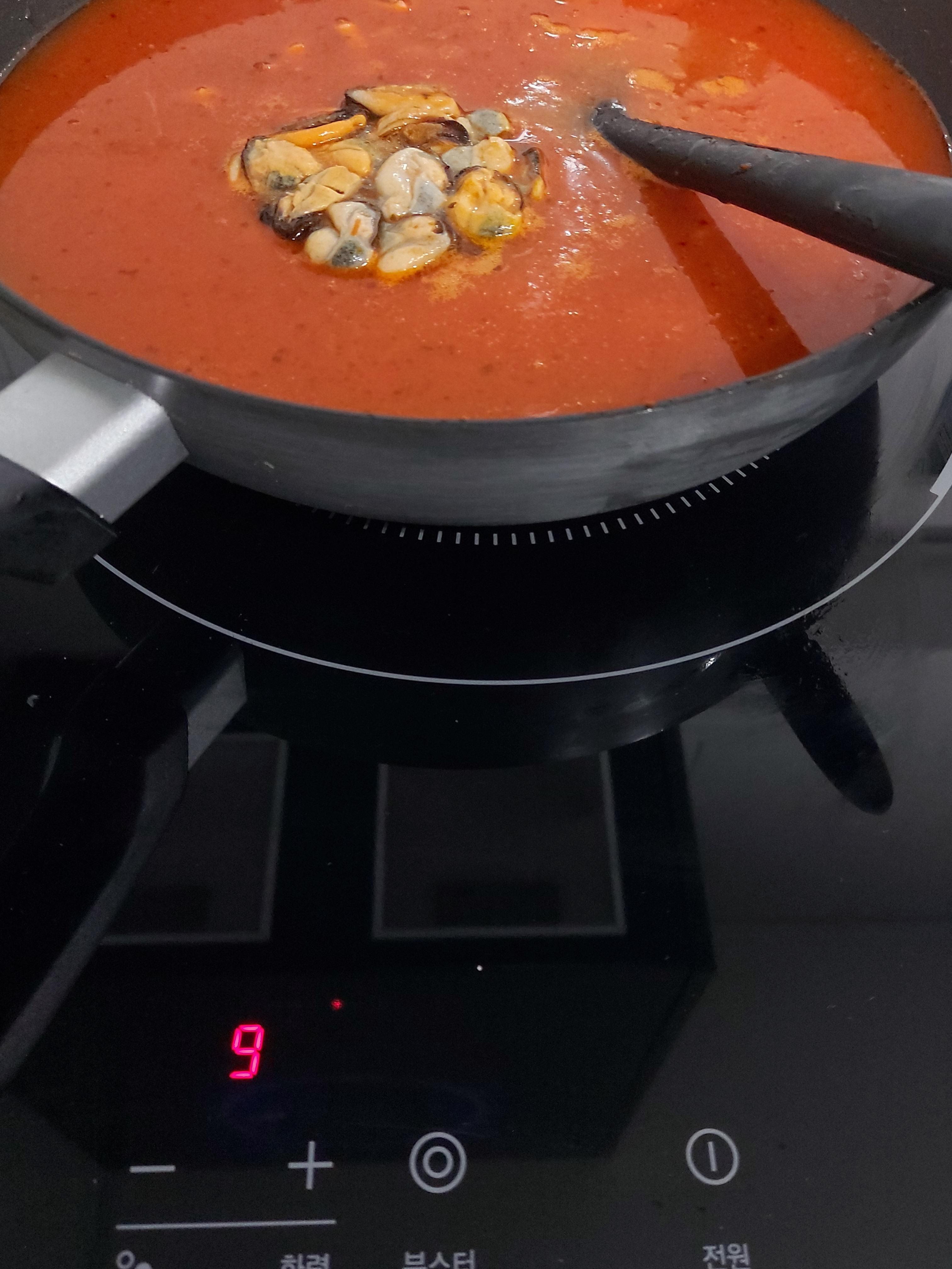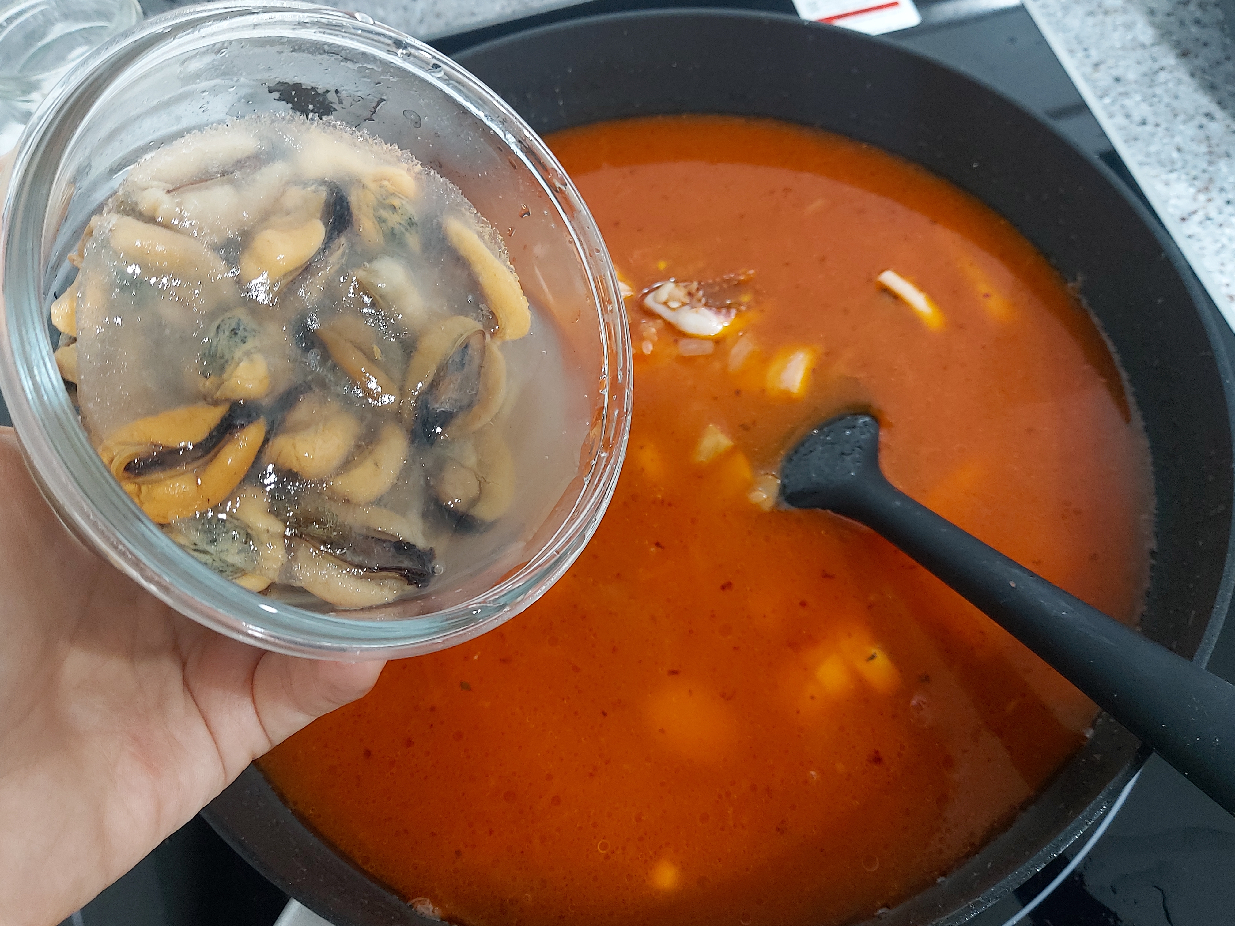 (어제 끓여둔 홍합이 냉동실에 있어 저는 넣어 주었습니다. 원래 편스토랑 어남선 빠에야 레시피에는 없는 과정이기 때문에 생략 하셔도 됩니다.)