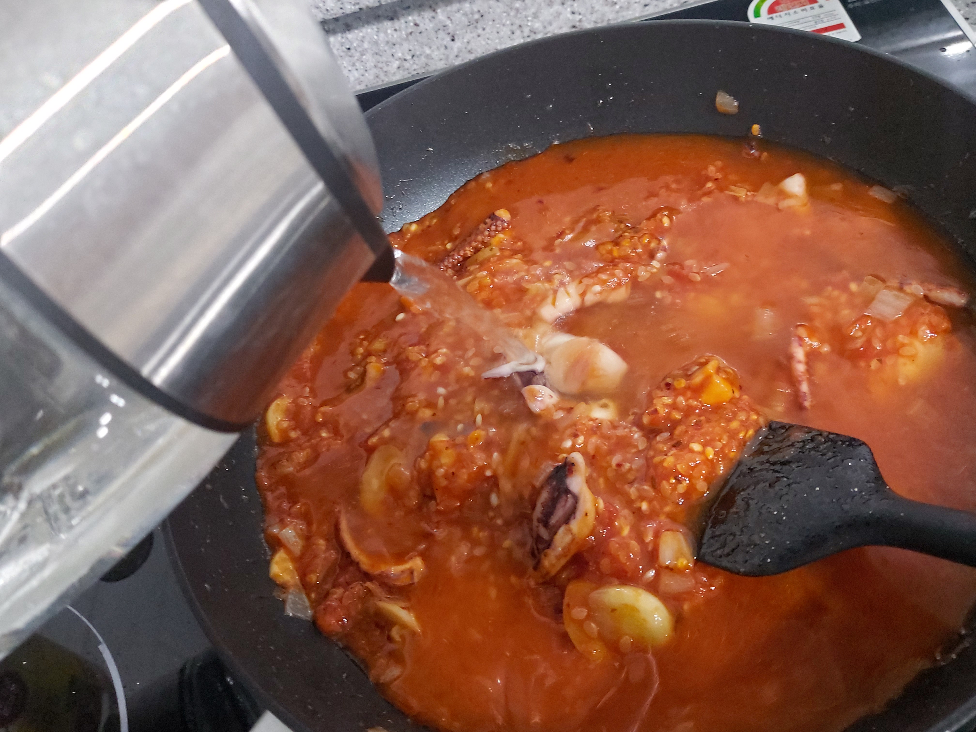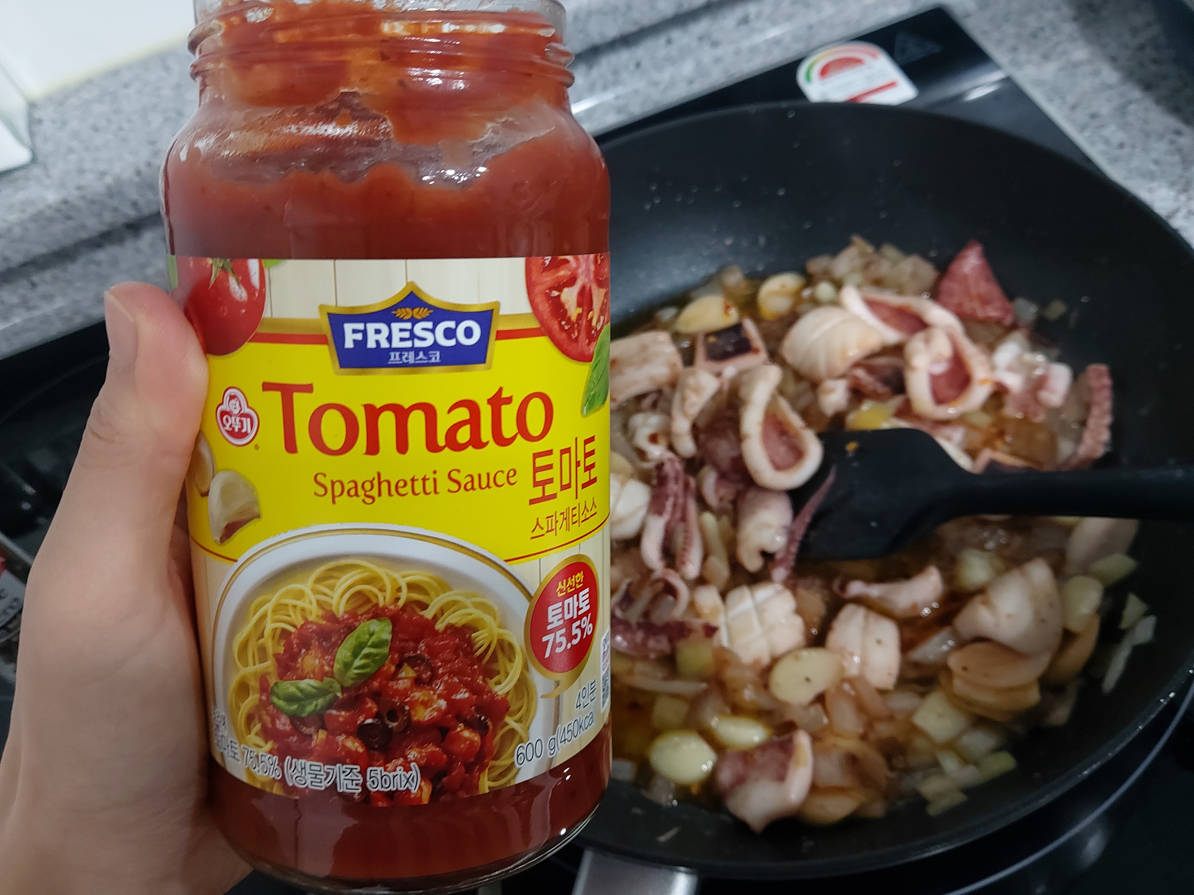 오징어가 페페론치노랑 잘 볶아지면서 매~콤하고 맛있는 냄새가 났습니다.원래 편스토랑 류수영씨는 통조림에 들어있는 '홀토마토' 소스를 사용했는데, 저는 집에 있는 '토마토 스파게티 소스'를 사용 했습니다.