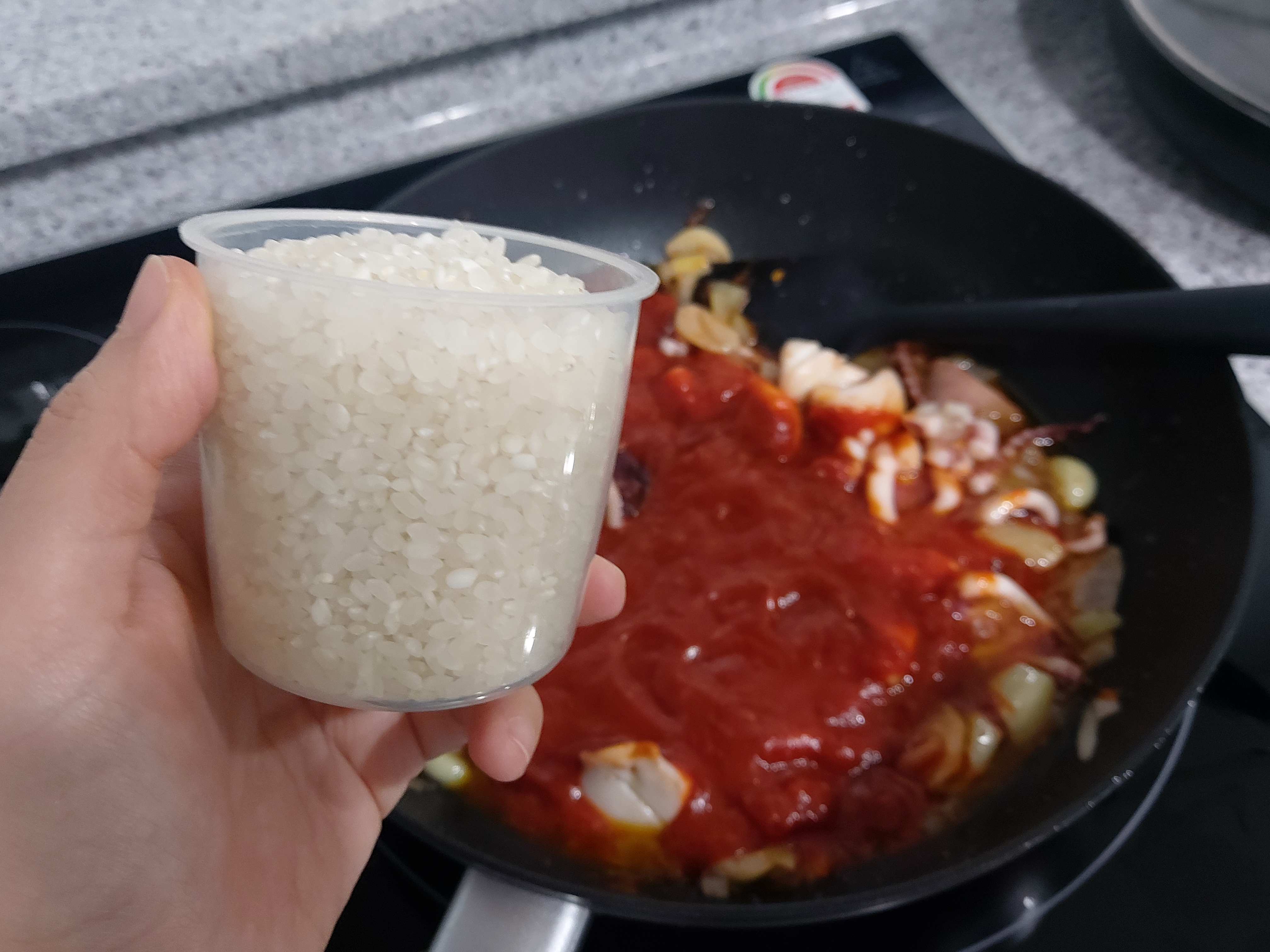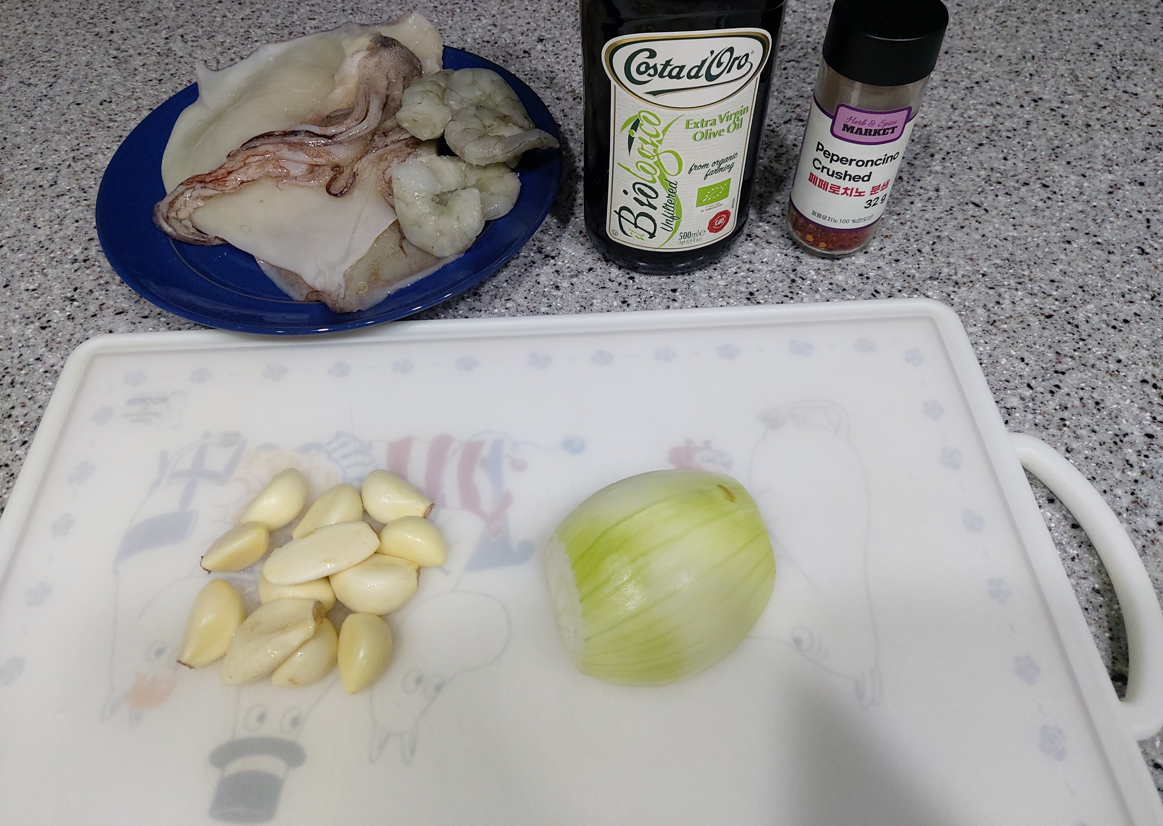 양파 1/2개, 마늘 10개, 오징어, 새우, 올리브유, 토마토 소스, 페페론치노(또는 청양고추) , 생쌀냉동실에 얼려두었던 오징어와 새우가 있을때 만들어 보시면 좋을 것 같아요.