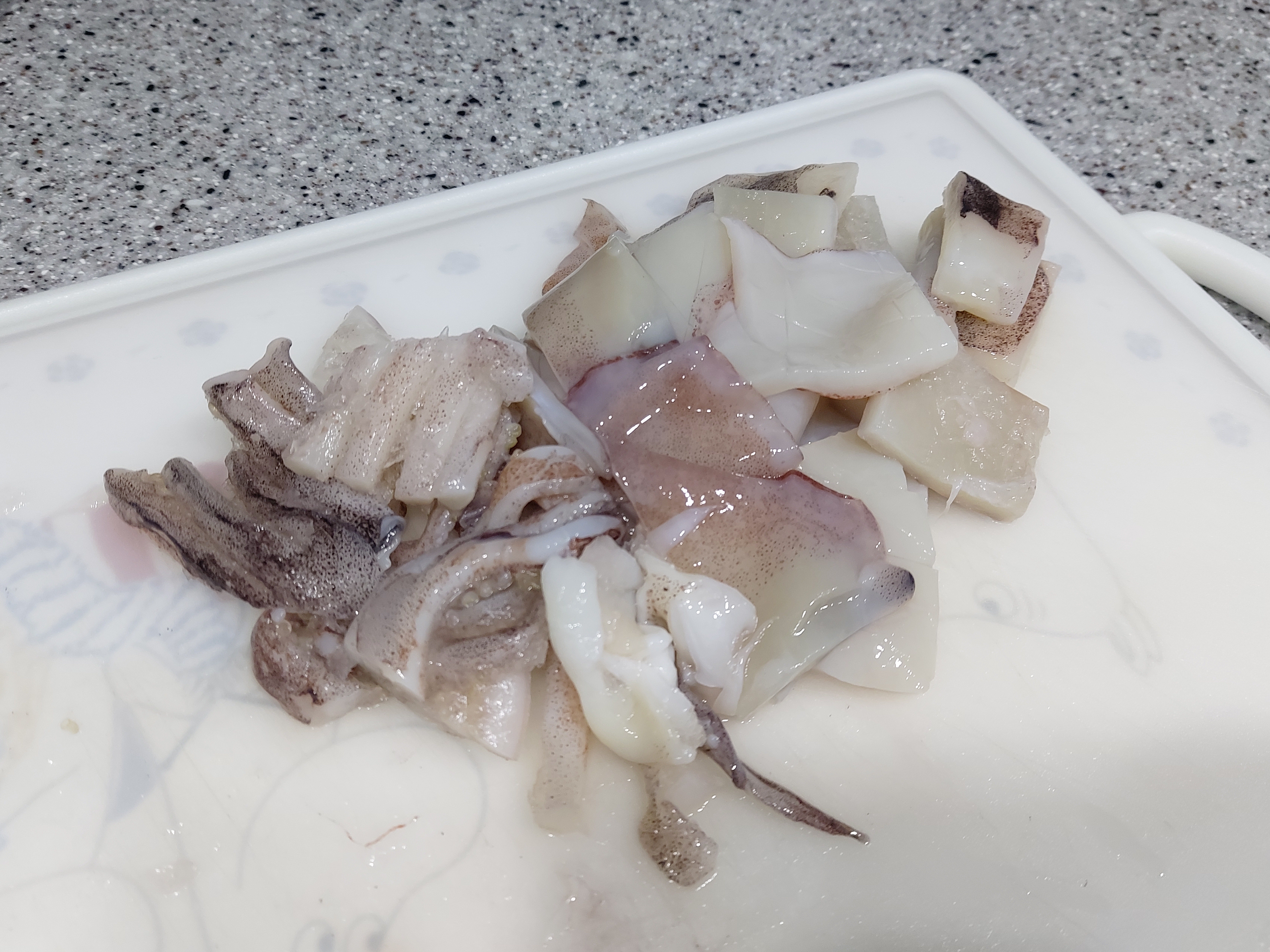 오징어에도 칼빕을 내어 먹기 좋은 크기로 준비해주세요.