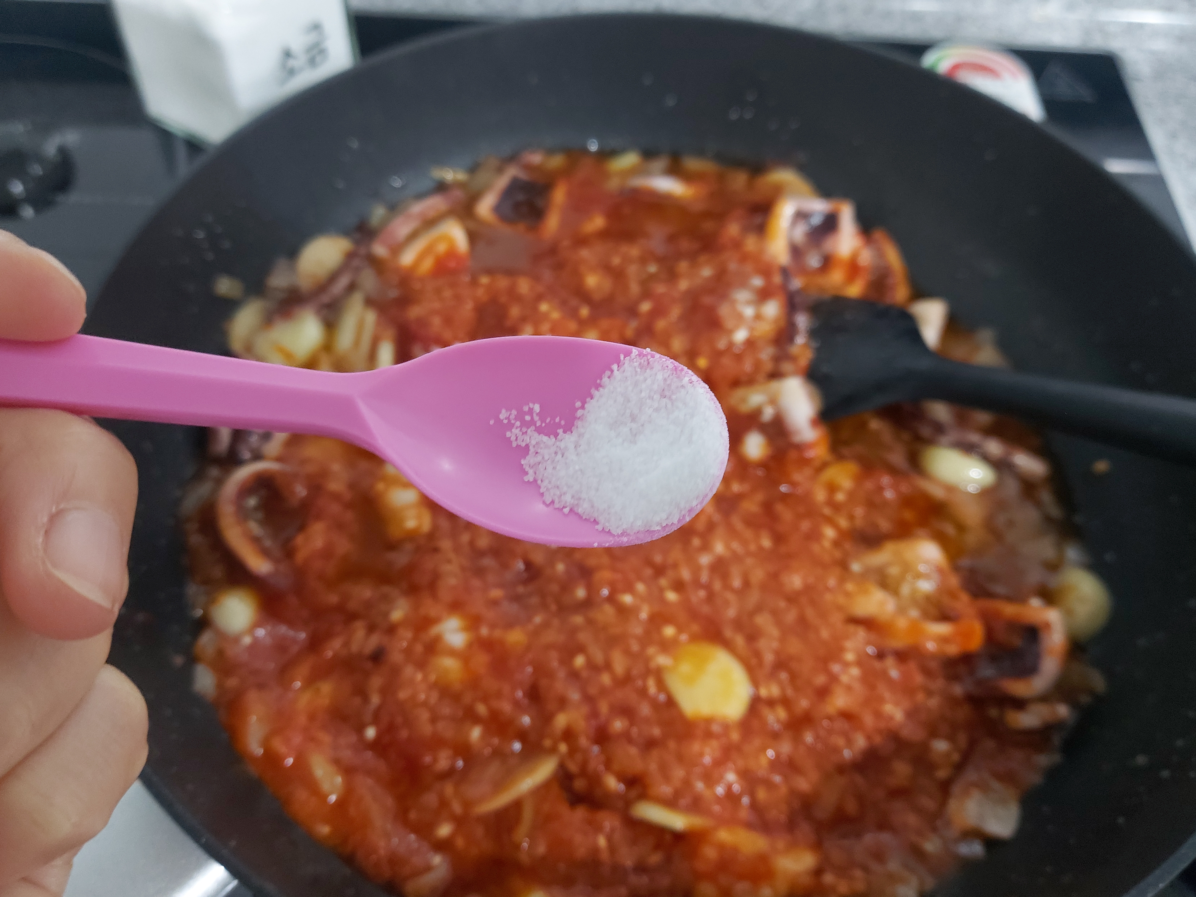 편스토랑에서 류수영씨가 생쌀은 처음에 닿는 물을 70% 흡수한다고 하더라고요 . 그래서 오징어+마늘+양파를 충분히 볶아 넣은 물을 흡수시켜 밥알까지 간이 베이게 하기 위해서 생쌀을 넣는 거라고 합니다.소금 1/2 작은 숟가락 넣어주세요.