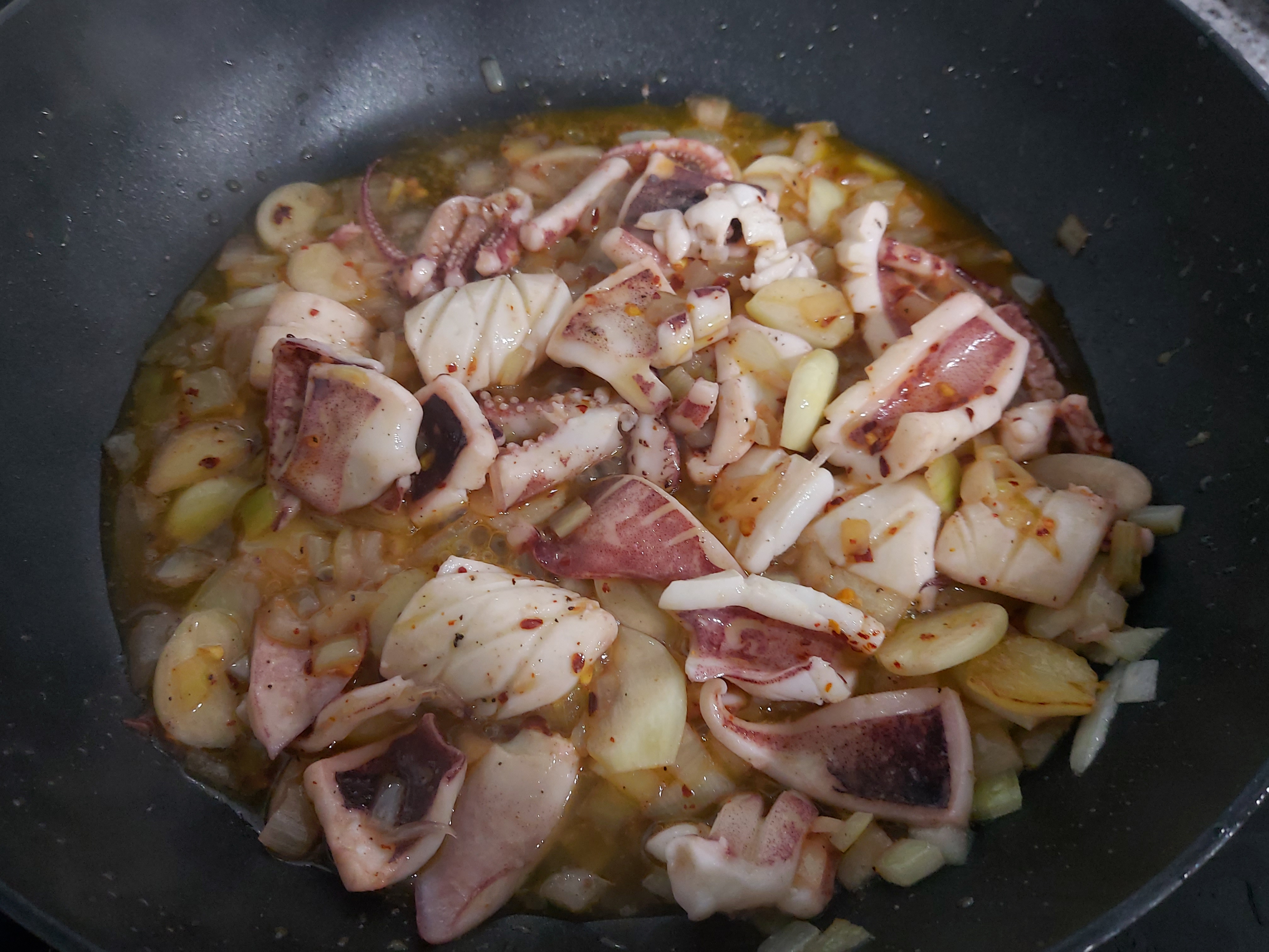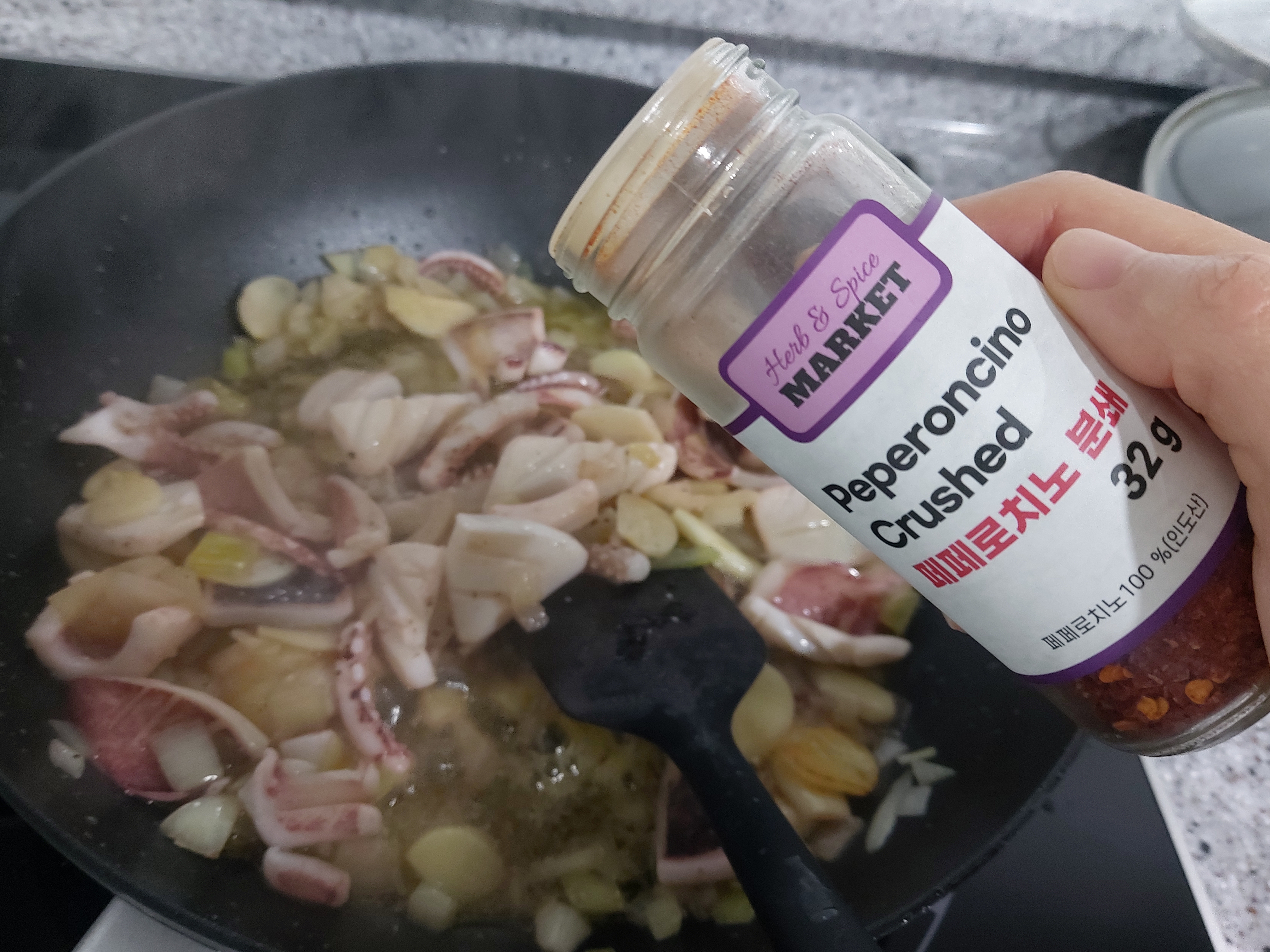 오징어를 넣고 페페론치노릉 넣어 같이 볶아주세요. 페페론치노가 없으면 청양고추를 넣어서 볶아 주세요!