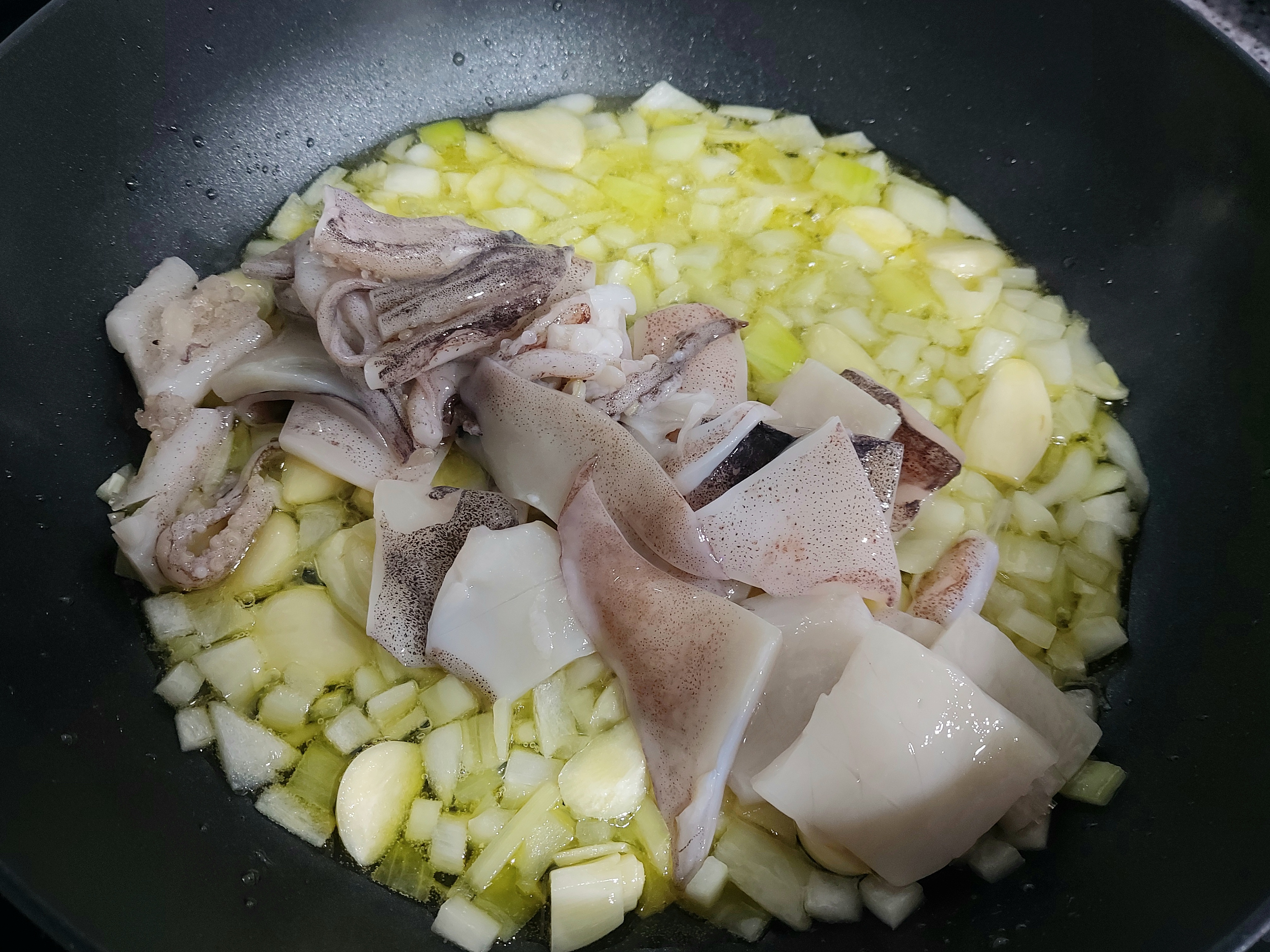 양파가 노릇한 색깔로 변하게 되면 오징어를 넣어 같이 볶아 주세요.
