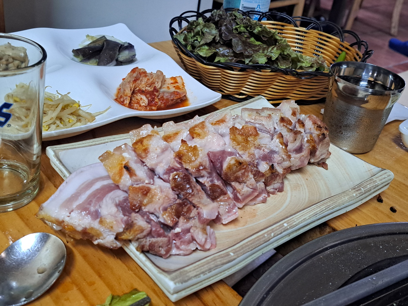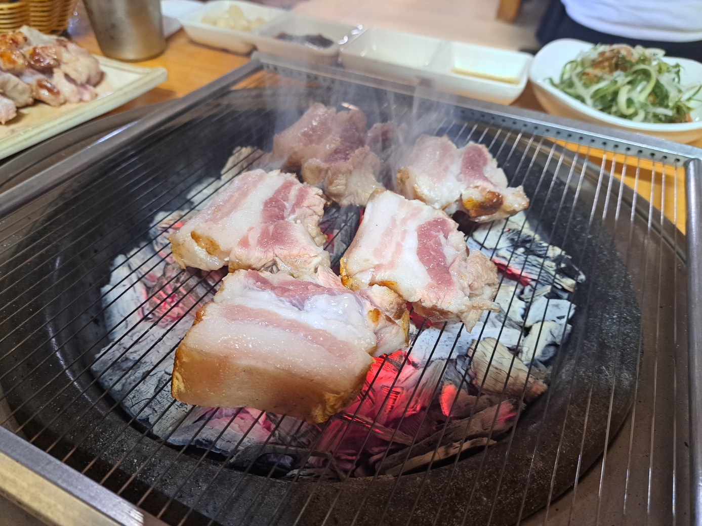 숯불로 구워서 돼지고기 오겹살의 불필요한 기름은 쫙 빠지고, 숯의 향이 훈연되서 정말정말 맛있었어요.