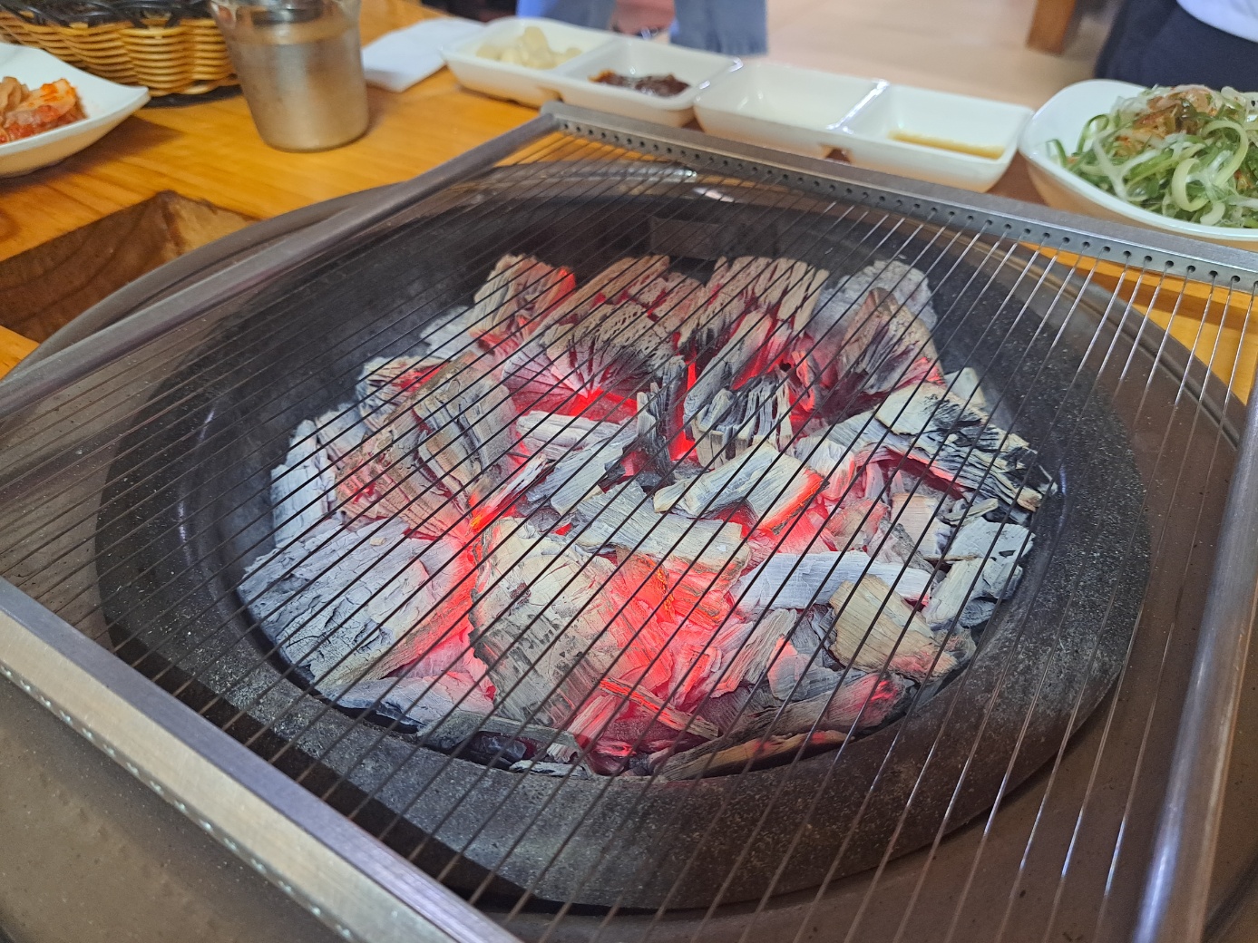 숯불 불판 위에서 오랫동안 식지 않고 따뜻하게 먹을수도 있고 오랜만에 옛날스타일의 고기?를 맛있게 먹고 나왔습니다.