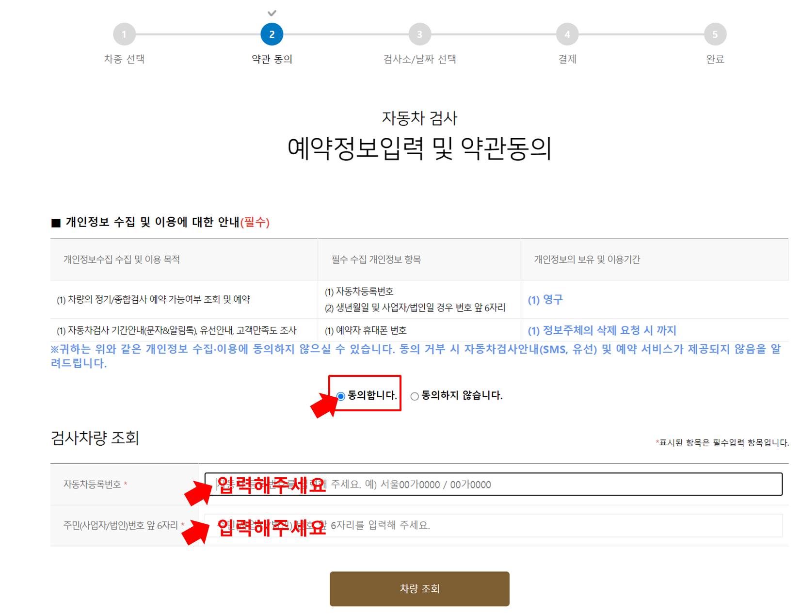 한국 교통안전공단 홈페이지 - 자동차검사 예약 동의합니다 (필수) → 자동차 등록번호 → 차량 소유주 주민번호 (또는 법인번호) 입력 및 차량조회