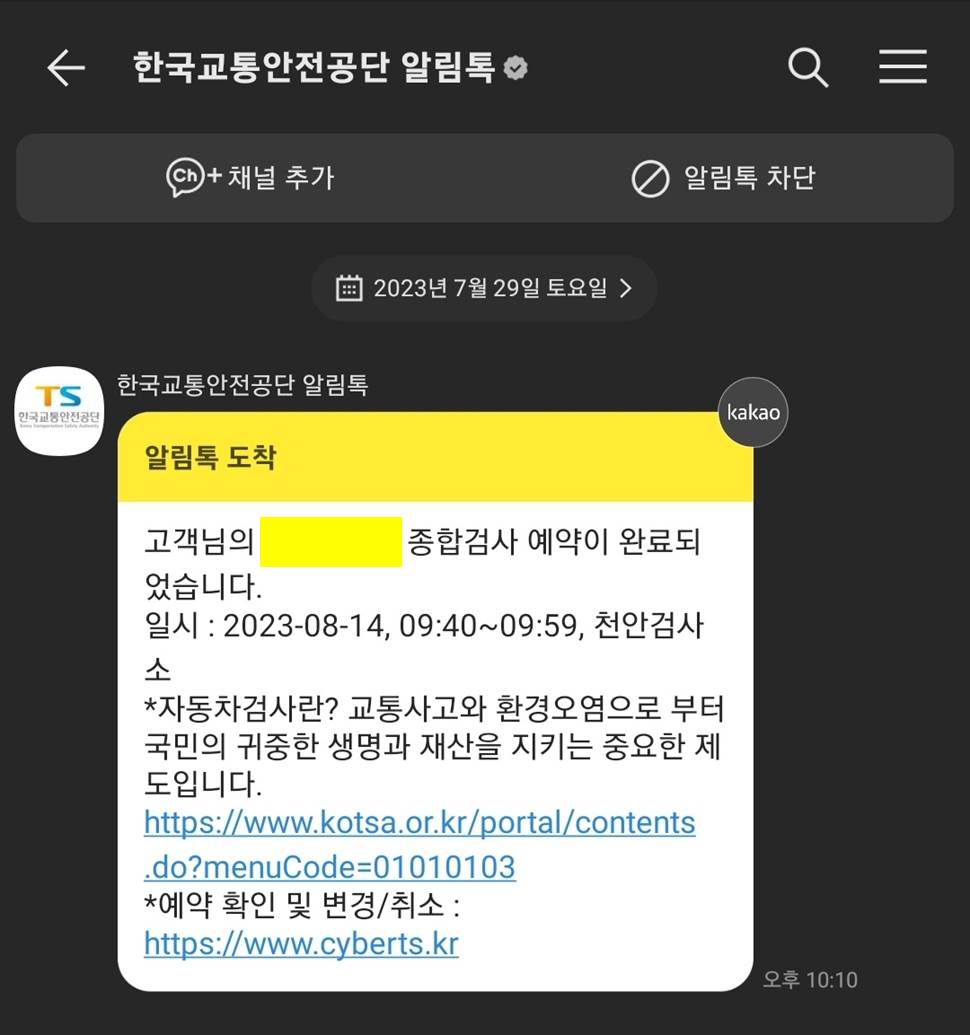 한국 교통안전공단 - 자동차검사 예약 - 자동차검사 천안검사소 예약 이후, 카카오톡으로도 한국교통안전공단에서 알림톡이 와서 예약이 확실히 되었음을 알려 줍니다.