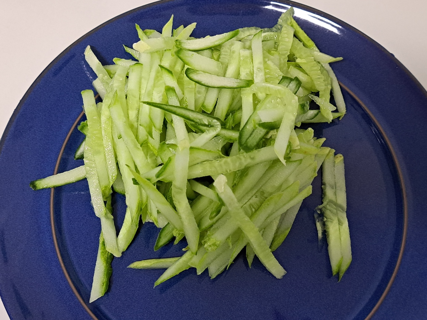 여름철 별미 묵밥 만들기 오이 1개를 씻어서 후다닥 채썰어 준비해 줍니다.