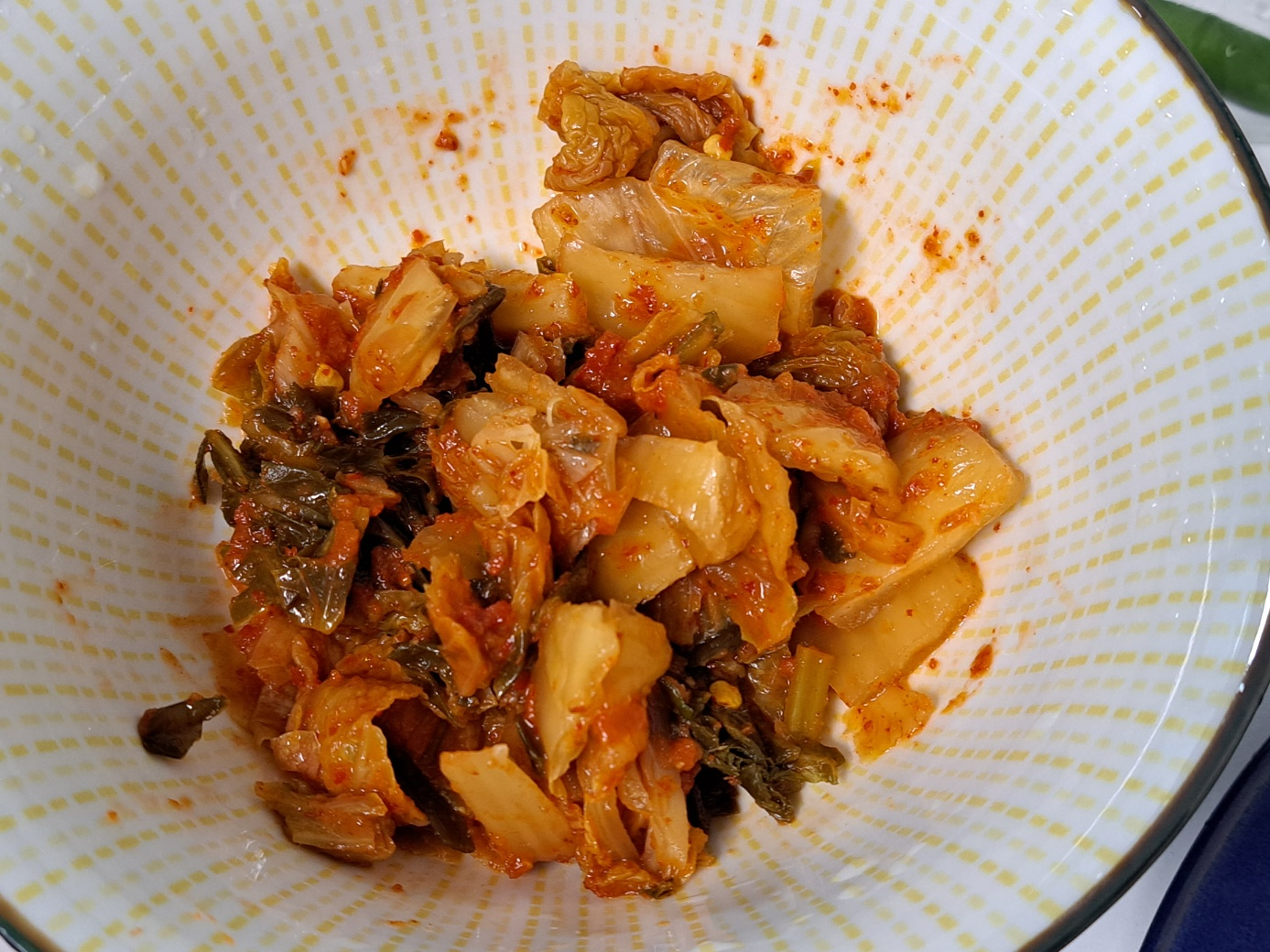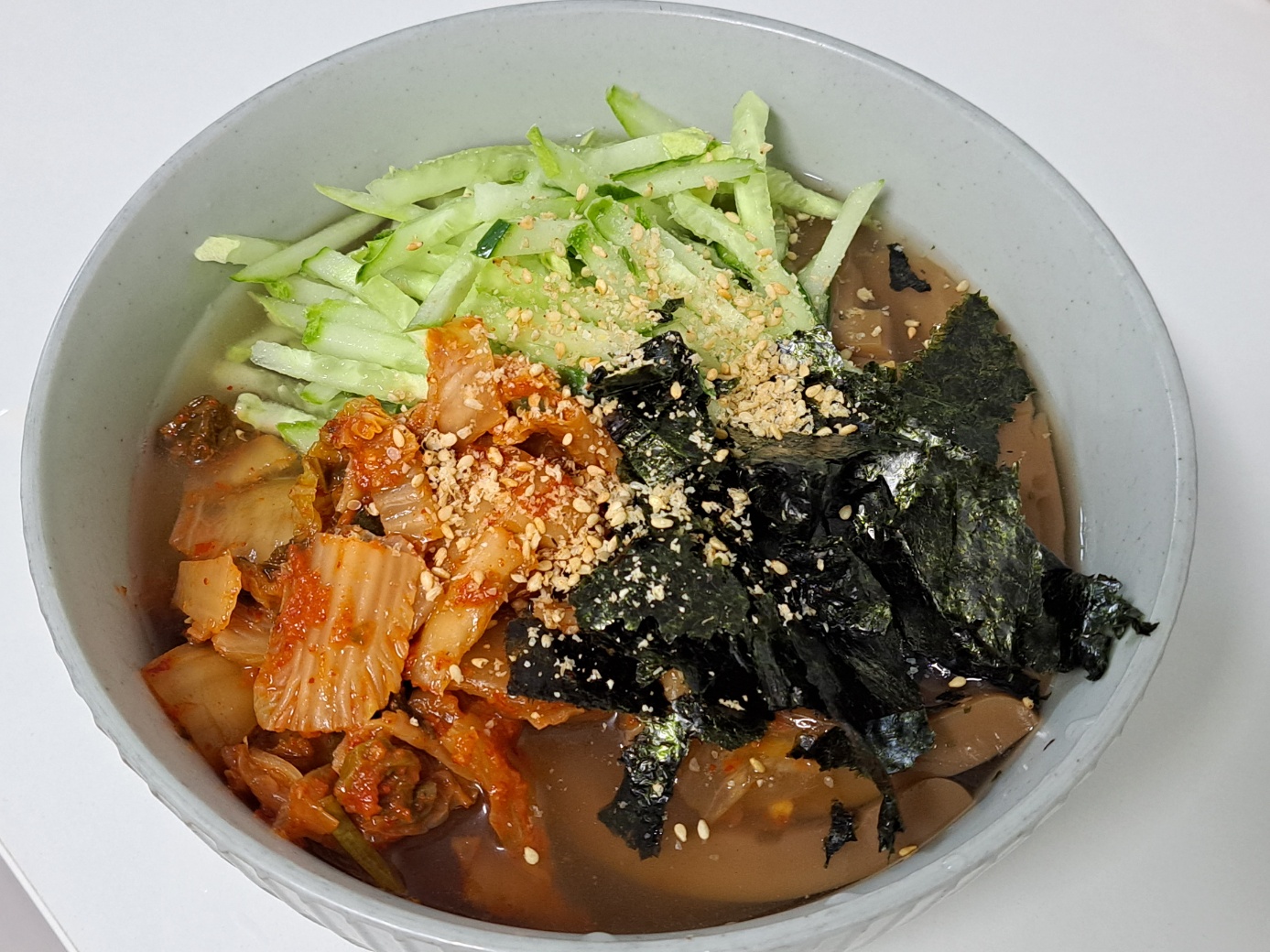 (약간 신 김치를 넣으시길 추천드립니다. 약간 신 김치가 묵밥에 잘 어울리더라고요.)