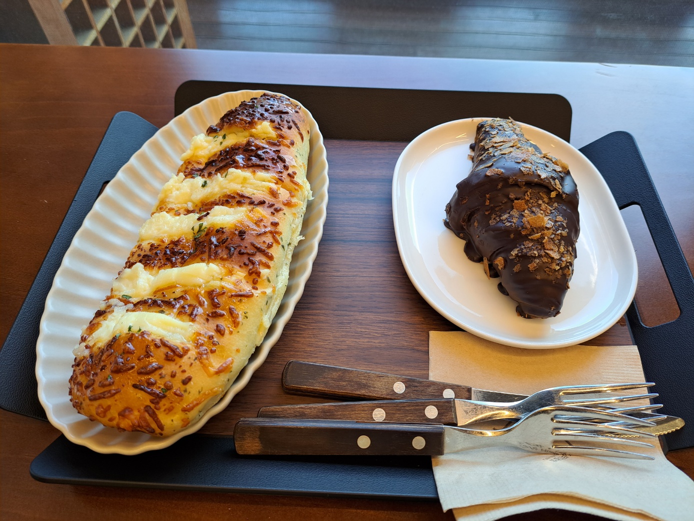 오른쪽에 있는 초코 크루아상도 맛있게 잘 먹었습니다. 전반적으로 빵이 맛있었습니다.