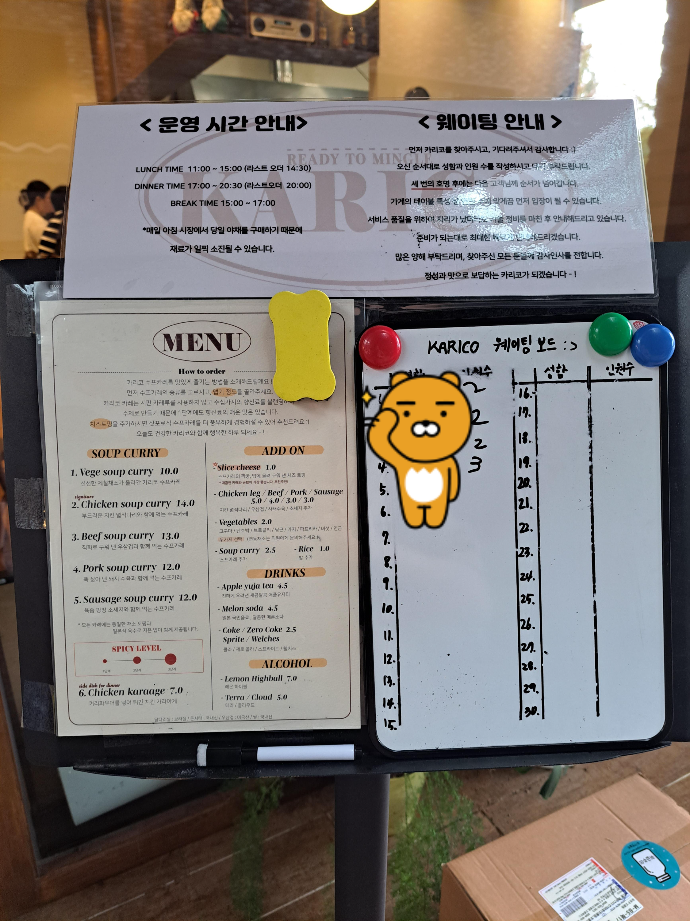 도룡동 카리코 식당 앞에 메뉴판 & 가격이 안내 되어 있고, 화이트보드에 웨이팅 순서대로 이름 & 동행인원 이름을 적고 기다렸습니다.