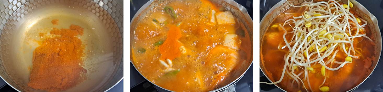 5. 양념장이 끓어 오르면 모든재료(냉동야채, 알, 고니) 와 콩나물, 두부를 넣고 15분간 더 끓여주면 끝 !