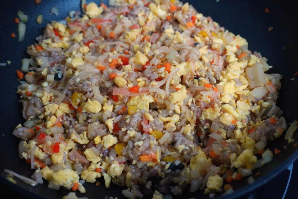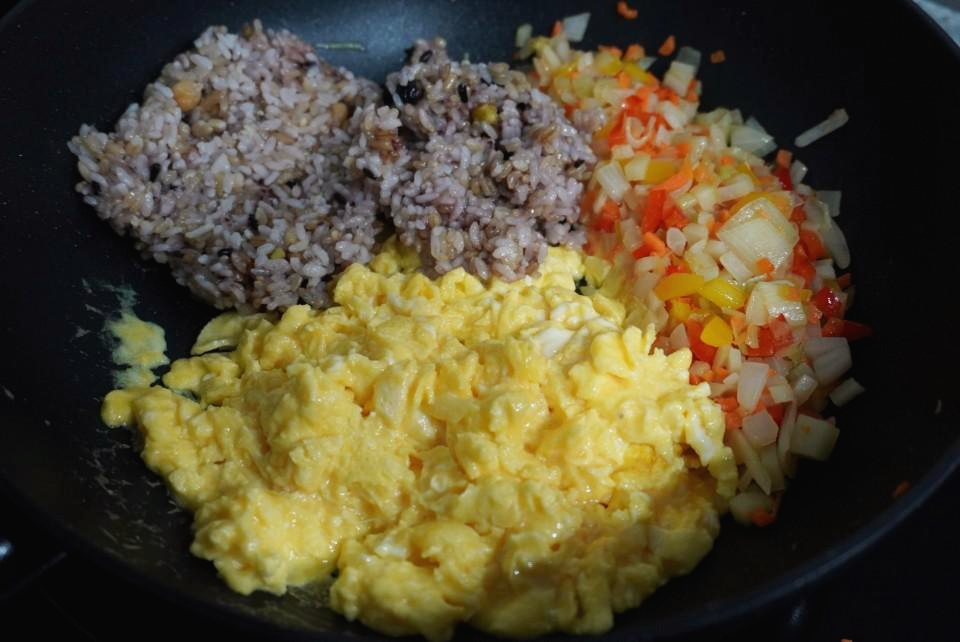 따뜻한 밥을 넣어 재료들과 섞어 준 뒤