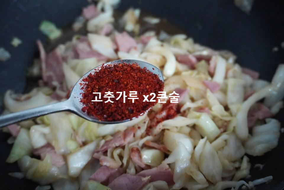 볶음우동 만들기 18 양배추에 고춧가루를 넣고 볶아
