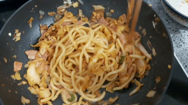 볶음우동 만들기 13 볶음우동 만들기 14 베이컨과 양배추가 볶아졌다면,