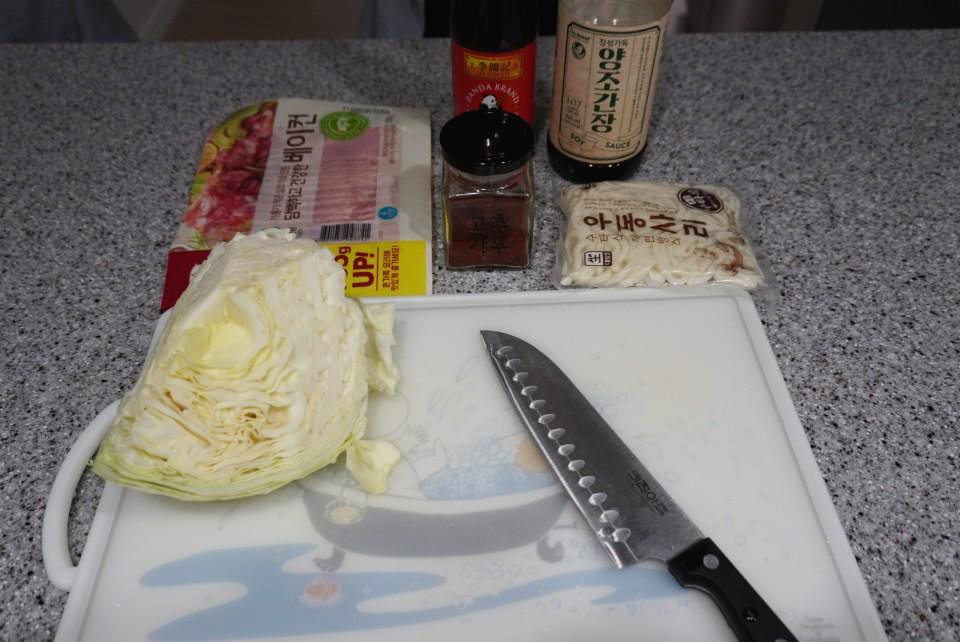 볶음우동 만들기 2 준비재료 : 베이컨, 양배추, 우동사리