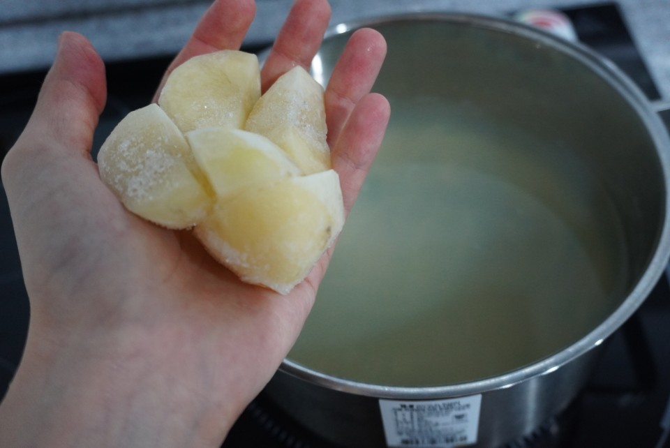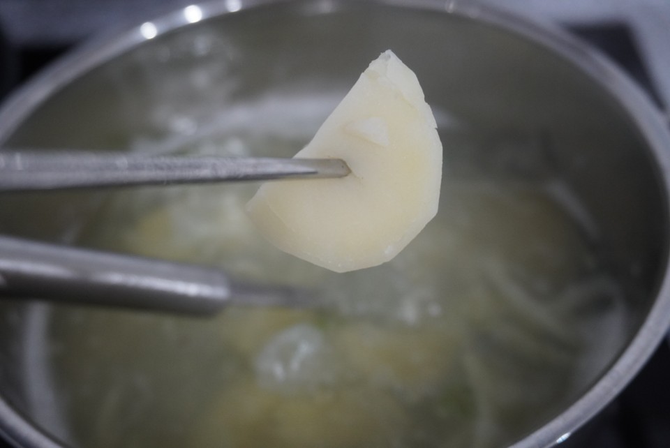 감자를 젓가락으로 푹 찔러서, 잘 익었으면