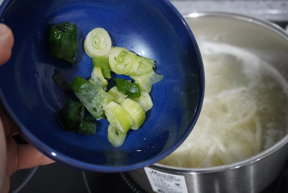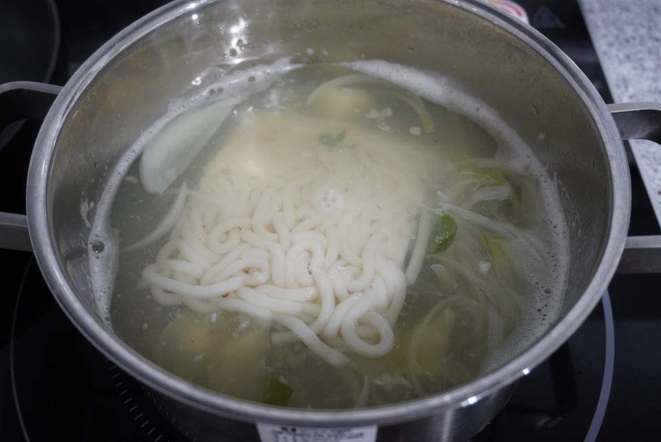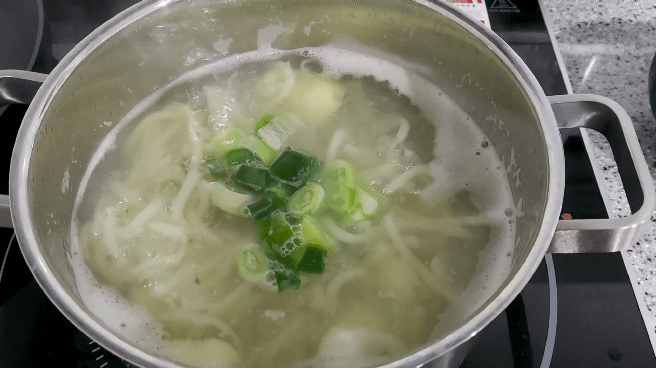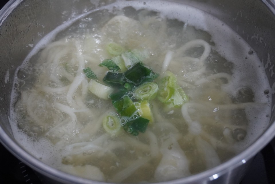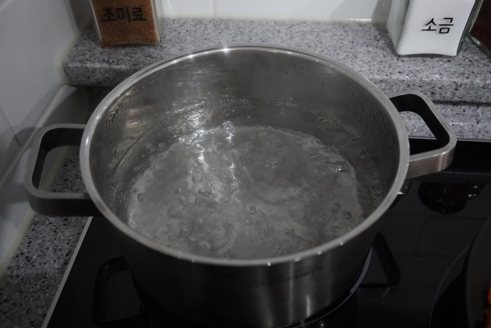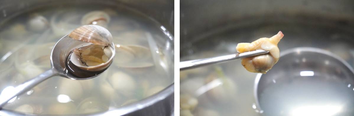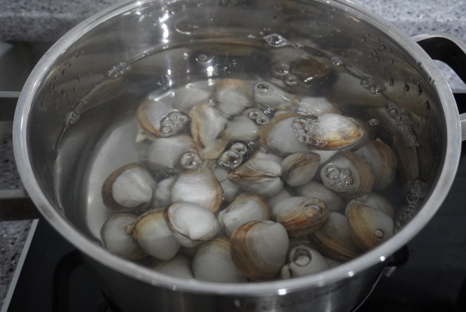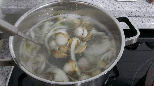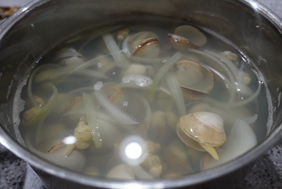 물이 팔팔 끓으면 그 때 조개를 넣어주세요 !
