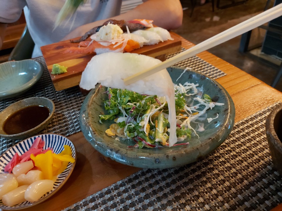 초밥을 한번 감싸고도 남을 길이의 사시미가 올려져 있습니다.