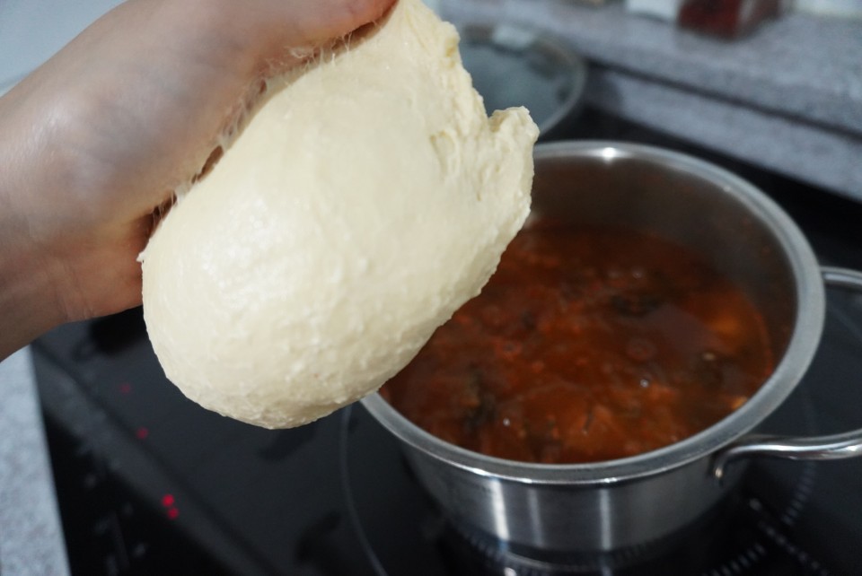 사진을 찍진 못했지만, 오른손 엄지와 검지로 찰지게 떼내어 얇게 펴서 바글바글 끓는 국물에 투척해 줍니다.
