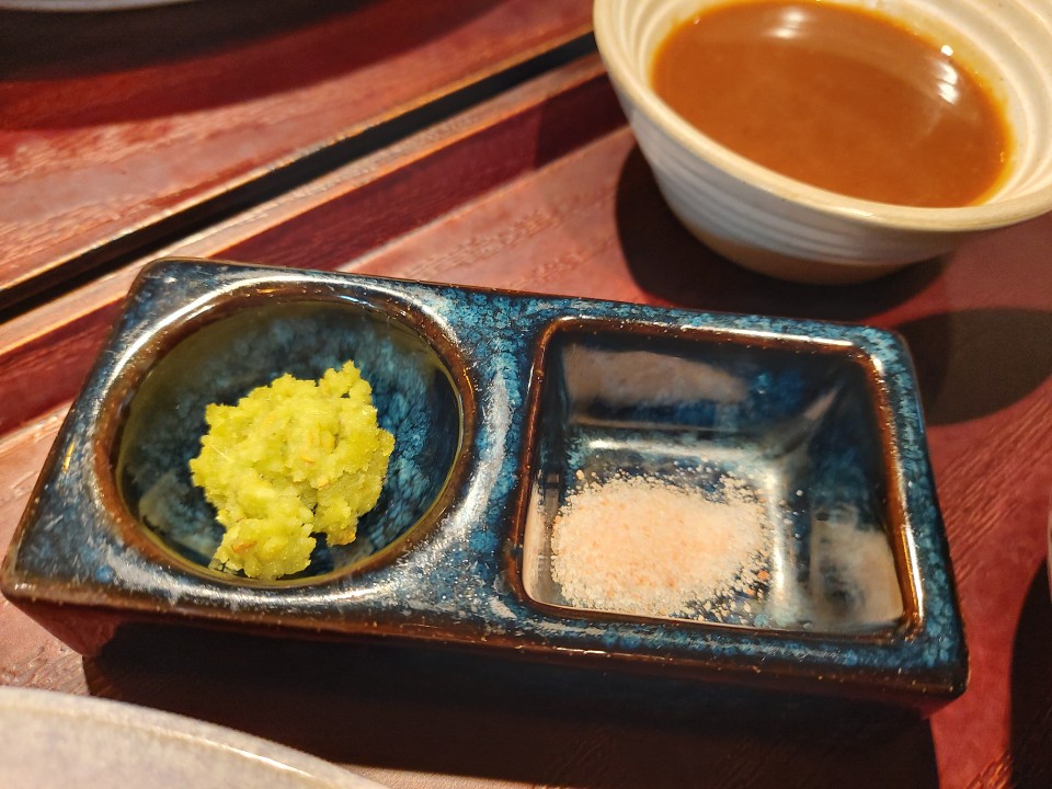저희는 히레카츠 1, 로스카츠1, +미니우동, 히말라야소금과 와사비를 추가하여 먹었습니다.