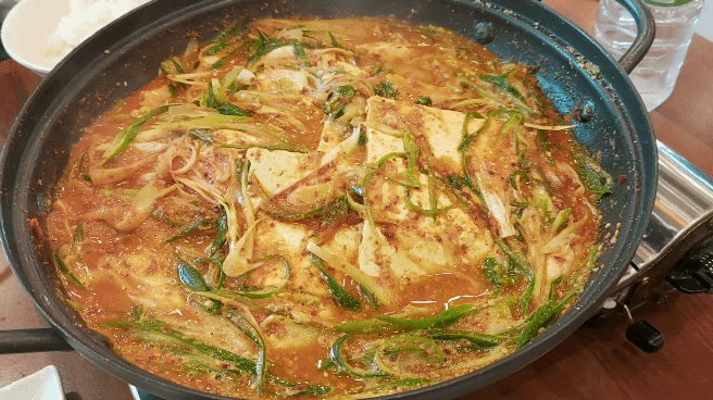 뭐랄까 두부두루치기와 두부조림 사이라고나 할까요. 대파가 듬뿍 올라가