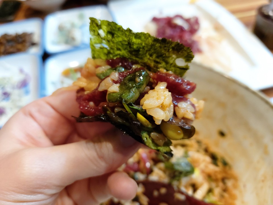 비빔밥 자체로도 맛있는데 김에 싸먹으니까 친근하니 맛있는 맛이라