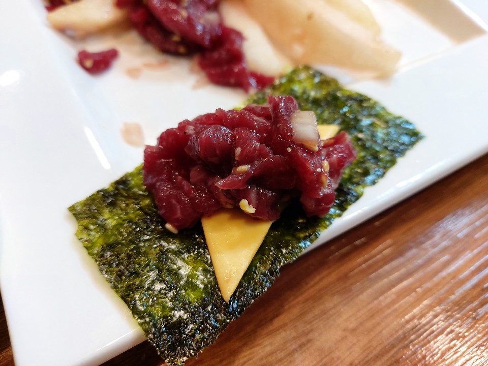 육회의 부드럽고 고소한맛이 치즈와 잘 어울리면서 치즈의 고소함도 배로 느낄 수 있는 조합이였어요.