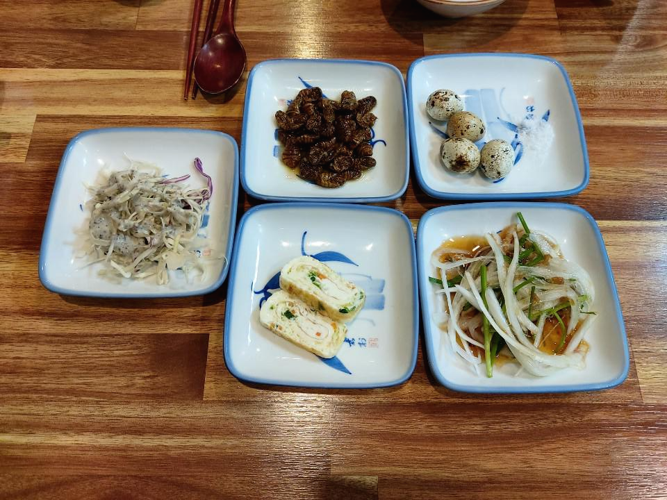 새콤한 양파절임, 그리고 까먹는 재미가있는 메추리알까지 간단하게 요기를 했습니다.