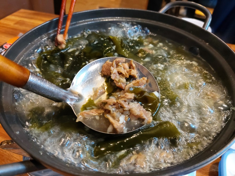 고기와 마늘이 적절하게 들어 있어서 끓이면 끓일수록 맛있어지는 미역국 이였습니다.